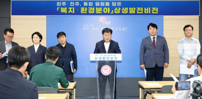 시와 완주·전주 상생발전 전주시민협의위원회(위원장 박진상)는 22일 시청 브리핑룸에서 진교훈 복지환경국장을 비롯한 담당 분야 간부공무원과 박진상 위원장 등이 참석한 가운데 ‘완주-전주 통합 염원을 담은 상생발전 비전’ 브리핑을 통해 복지분야 상생발전 비전을 제시했다.