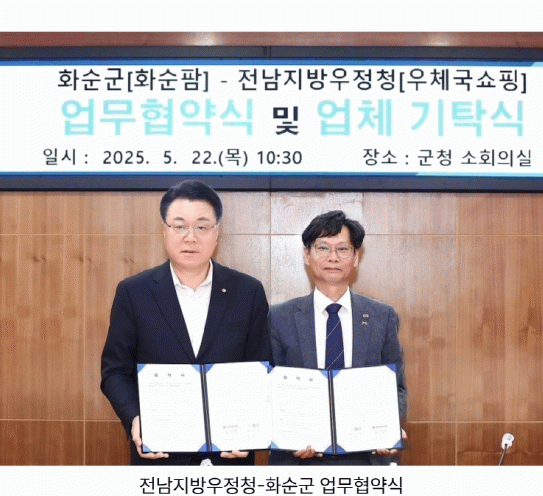 이날 체결된 협약에 따라 양 기관은 ▲화순군 농수축산물의 온라인 유통 활성화 ▲우체국 쇼핑몰, 화순팜 등 유통 채널을 통한 판매 촉진 ▲지역상품 판매 수익을 활용한 취약계층 지원 등 다양한 분야에서 상호 협력하기로 했다.