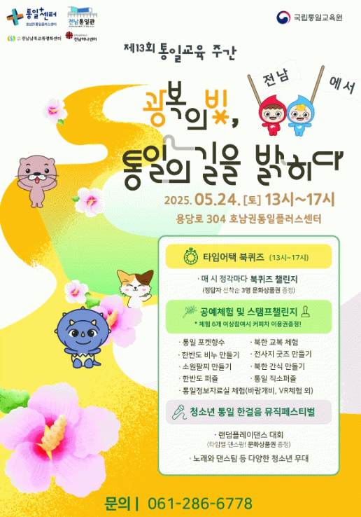 김진선 호남권 통일+센터장은 “제13회 통일교육주간을 맞아 도민이 통일과 광복에 대해 고민하고, 평화와 통일에 더 많은 관심을 갖게 되길 기대한다”고 말했다.