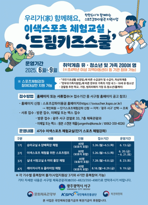 모집 인원은 1기 40명, 2기 80명이며, 신청은 오는 26일부터 6월 5일까지 스포츠 강좌 이용권 누리집을 통해 접수 가능하며, 서구청 체육관광과를 직접 방문해 신청하는 것도 가능하다.