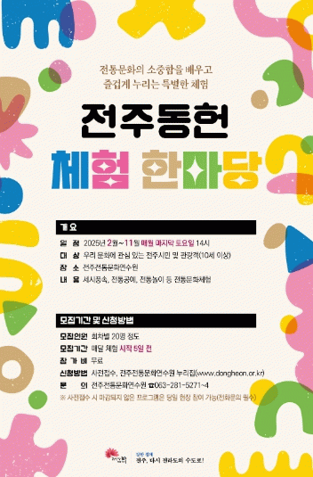 프로그램에 참여를 희망하는 시민과 관광객은 전주전통문화연수원 누리집을 통해 사전 접수하면 되며, 체험비는 무료이다. 사전 접수 시 마감되지 않은 프로그램은 당일 현장 참여도 가능하며, 기타 자세한 사항은 전주전통문화연수원 누리집에서 확인하거나 전화로 문의하면 된다.