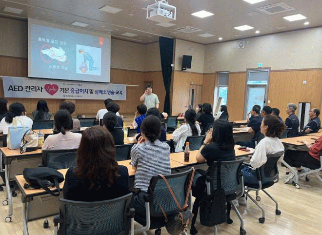 ▲심정지 인식 및 119신고 요령 ▲가슴압박 중심의 심폐소생술(CPR) 실시 방법 ▲자동심장충격기(AED) 작동법 등으로 구성됐으며, 응급의료 전문 강사의 지도 아래 실제 상황을 가정한 실습이 함께 이뤘졌다.