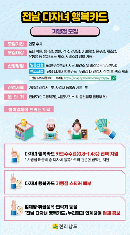 ‘전남 다자녀행복카드’는 막내가 18세 이하인 2자녀 이상 가정에 발급되는 카드로, 교육비, 의료비, 주유비, 외식비 등 일상생활 전반에서 다양한 할인 혜택을 제공한다.