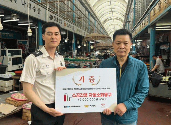 봄철 화재예방대책 특수시책으로 진행된 이번 사업은 화재 시 많은 피해가 예상되는 전통시장의 전기화재를 예방하고자 ㈜오라이온코리아와 소방가족희망나눔 재단의 도움을 받아 추진됐다.