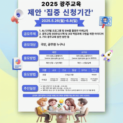 공모 주제는 ▲AI‧디지털 프로그램 및 소프트웨어(SW)를 활용한 미래교육 방안 ▲광주교육 5대 주요시책(다양성교육, 책임교육, 공정교육, 미래교육, 상생교육) 및 3대 역점과제(다양성을 품은 실력향상, 미래로 가는 AI교육, 모두가 동행하는 시민협치) 구현을 위한 아이디어 ▲기타 광주교육 발전 방안 등 3개다.