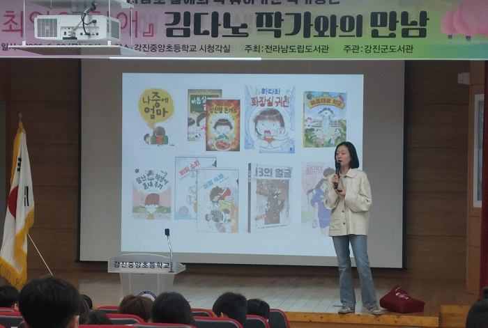 이번 행사는 전라남도립도서관이 주관하고 강진군도서관이 주최한 독서문화프로그램의 하나로, ‘사랑이 우리를 자라게 한다’는 주제로 진행됐다. 김다노 작가는 동화 ‘최악의 최애’를 중심으로 어린이들이 ‘사랑’이라는 감정에 눈뜨는 한 시절을 섬세하게 담아낸 다섯 편의 연작 동화 속 이야기를 들려주며 아이들과 감상을 나눴다.