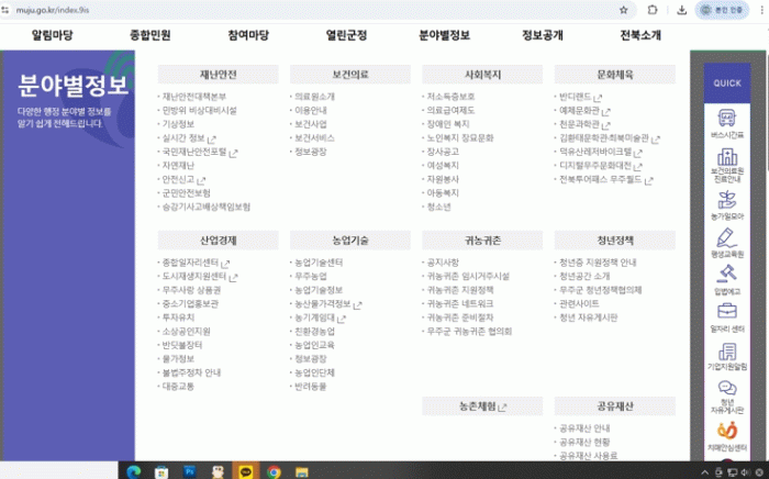 무주군 공유재산 정보는 무주군청 누리집 ‘분야별 정보 -' 공유재산’ 메뉴를 통해 △공유재산의 종류, △사용 허가 절차, △매각 절차, △무주군 재산 현황, △토지 및 건물 사용료 계산 기능 등 분야별 정보 확인이 가능하다.