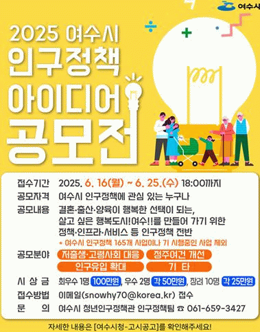 공모전에 대한 자세한 사항은 여수시 누리집 또는 청년인구정책관 인구정책팀을 통해 안내받을 수 있다.