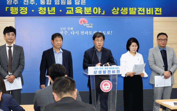 시와 완주·전주 상생발전 전주시민협의회(위원장 박진상)는 26일 시청 브리핑룸에서 △공정한 행정 운영체계 구축 △교육격차 해소 △청년의 안정적 정착 지원 등을 골자로 한 구체적인 통합시 운영 방향을 담은 행정·교육·청년 분야의 상생발전 비전을 제시했다. 이날 브리핑에는 이강준 시 기획조정실장과 이미숙 기획행정 분과 위원, 신윤호 교육문화분과 위원장, 김선목 청년분과 위원장 등이 참석했다.