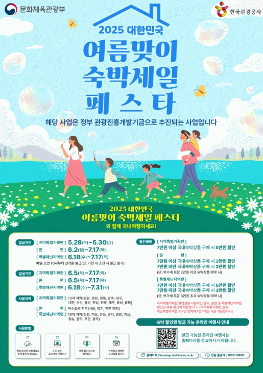 할인권 사용 방법 등 기타 자세한 사항은 ‘2025 대한민국 여름맞이 숙박세일 페스타’ 누리집 또는 콜센터에 문의하면 된다.
