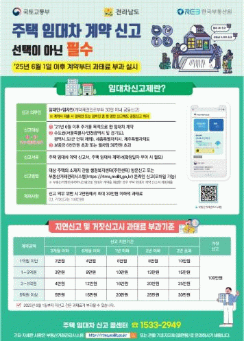 전남도 관계자는 “주택 임대차 계약 신고제는 건전한 임대차 문화를 조성하고 임차인의 권리를 사전에 보호하기 위한 제도”라며 “신고 의무 위반에 따른 과태료 등 불이익이 발생하지 않도록 계약 시 지체없이 신고하길 바란다”고 말했다.