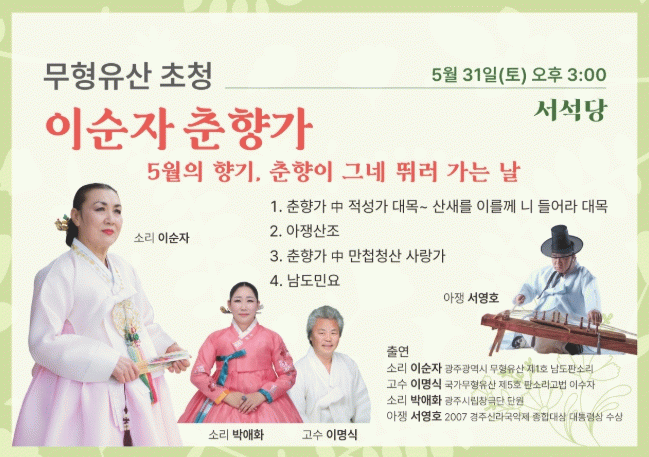 이날 무대는 이순자 명창의 제자이자 광주시립창극단 단원으로 활동중인 소리꾼 박애화 씨와 2007 경주신라국악제 종합대상 대통령상을 수상한 아쟁연주자 서영호 씨와 함께 국가무형유산 제5호 판소리고법 이수자인 이명식 고수가 함께한다.