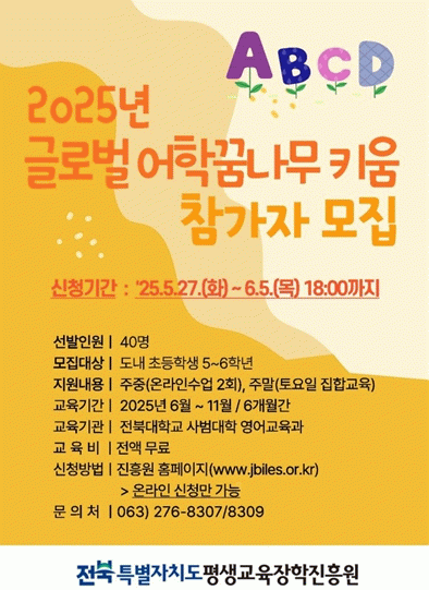 이현웅 전북특별자치도평생교육장학진흥원 원장은 “이번 글로벌 어학꿈나무 키움사업은 영어에 대한 흥미를 높이고, 실생활에 필요한 실용 영어 역량을 기를 수 있는 좋은 기회가 될 것”이라며 “전북대학교와의 협력을 통해 보다 전문적이고 체계적인 프로그램을 지속적으로 제공하겠다”고 밝혔다.