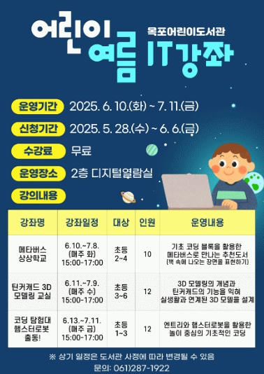 2025년 여름 IT강좌 프로그램은 ▲메타버스 상상학교(초등2~4학년) ▲틴커캐드 3D 모델링 교실(초등3~6학년) ▲코딩 탐험대 햄스터로봇 출동!(초등 1~3학년) 등 총 3개 강좌로 7월 11일까지 무료로 운영한다.