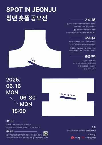 시와 (사)전주영상위원회는 오는 6월 16일부터 30일까지 ‘제1회 SPOT IN JEONJU 청년 숏폼 공모전’에 참가할 응모작을 접수한다.