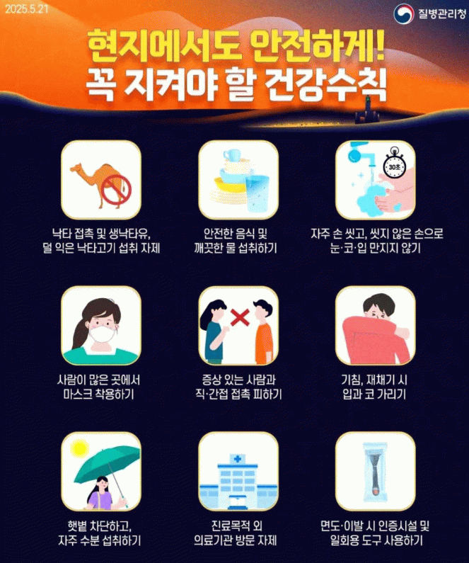 특히, 중동 지역에서는 메르스가 지속 발생하고 있어, 이슬람 하지(HAJJ) 성지순례 기간(2025년 6월 4일~9일)에 참여하거나 해당 기간 중 사우디아라비아를 방문하는 여행객은 현지에서 낙타 접촉, 생낙타유 및 덜 익힌 낙타고기 섭취, 진료 목적 외 의료기관 방문 자제 등 각별한 주의가 필요하다.