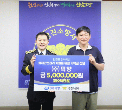 (주)덕양의 이연정 총괄이사는 5월 27일 강진소방서를 방문해 강진군 내 취약계층의 화재안전관리 지원을 위해 500만원을 기탁했다.