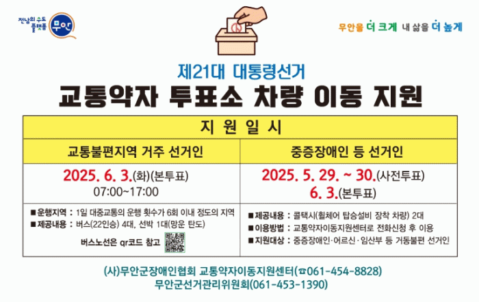 이용 신청은 오는 6월 3일까지 무안군선거관리위원회, 무안군 교통약자이동지원센터로 하면 된다.