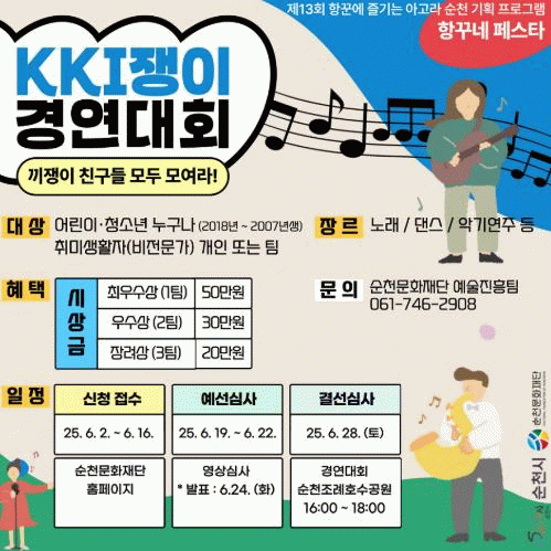 순천문화재단 관계자는 “이번 경연대회는 아동·청소년들이 끼와 재능을 마음껏 발휘할 수 있도록 기획된 참여형 예술 축제로, 많은 관심과 참여를 바란다”고 말했다.