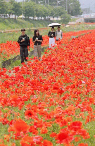 개화 시기가 다소 늦었던 작년과 다르게 올해는 좀 더 빨리 꽃양귀비가 만개해 천변을 따라 화려한 자태를 뽐내고 있다.