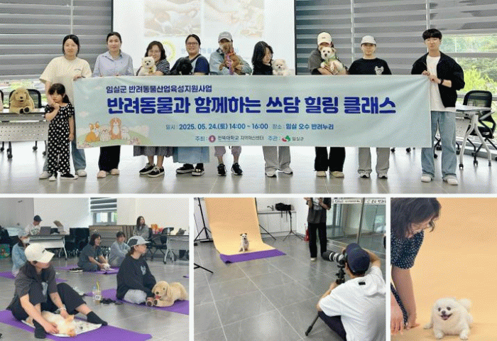 군은 최근 오수반려누리에서 반려동물 산업 육성 지원 사업의 일환으로 전북대학교 산학협력단 지역혁신센터와 협력하여 반려견과 보호자가 함께 참여하는‘쓰담 힐링 클래스’를 운영했다고 28일 밝혔다.
