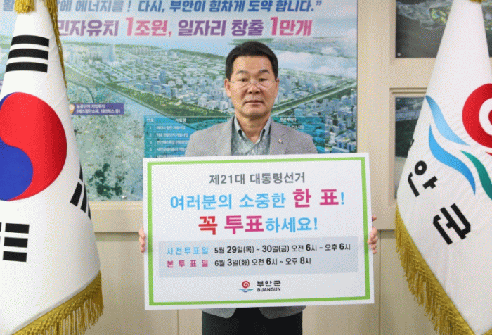 한편 부안군은 6월 3일 실시되는 제21대 대통령선거를 위해 사전투표소 13개소, 본투표소 22개소를 운영할 예정이며, 사전투표는 5월 29일과 30일 오전 6시부터 오후 6시까지, 본투표는 6월 3일 오전 6시부터 오후 8시까지 진행된다.
