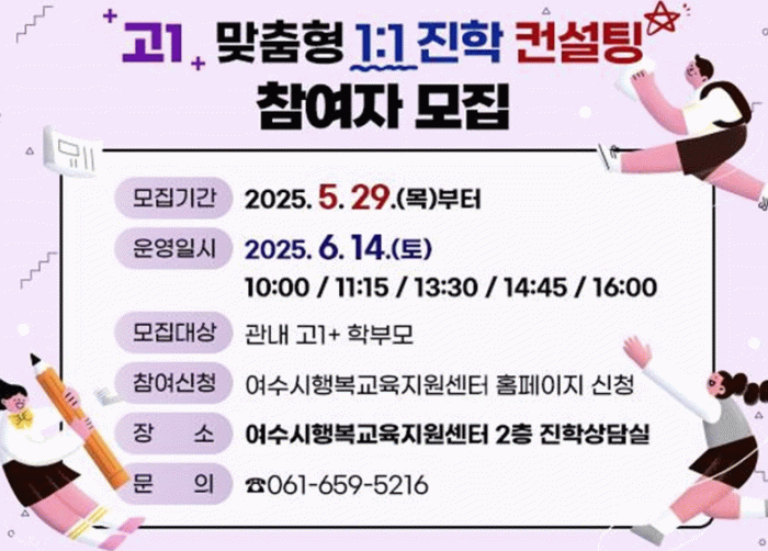 한편, 여수시행복교육지원센터에서는 최신 교육 추세를 반영해 ▲학년별 시기별 대입 진학 컨설팅 ▲대학생 선배 멘토링 ▲계열별 입시설명회 ▲학생부 및 공부법 특강 ▲고교학점제 특강 ▲대학 탐방 캠프 등 다양한 프로그램을 운영하고 있다.