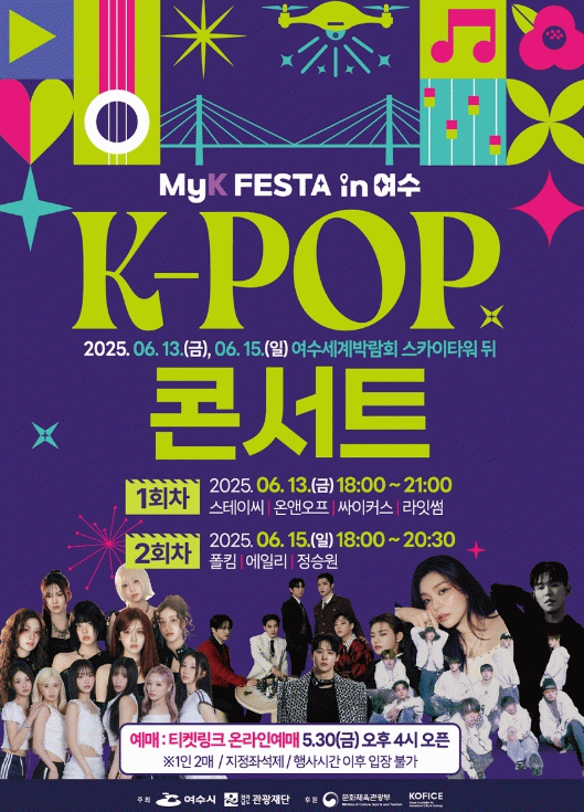 K-팝 콘서트는 1회차(6월 13일)와 2회차(6월 15일) 걸쳐 여수세계박람회장 스카이타워 뒤편 특설무대에서 열린다.