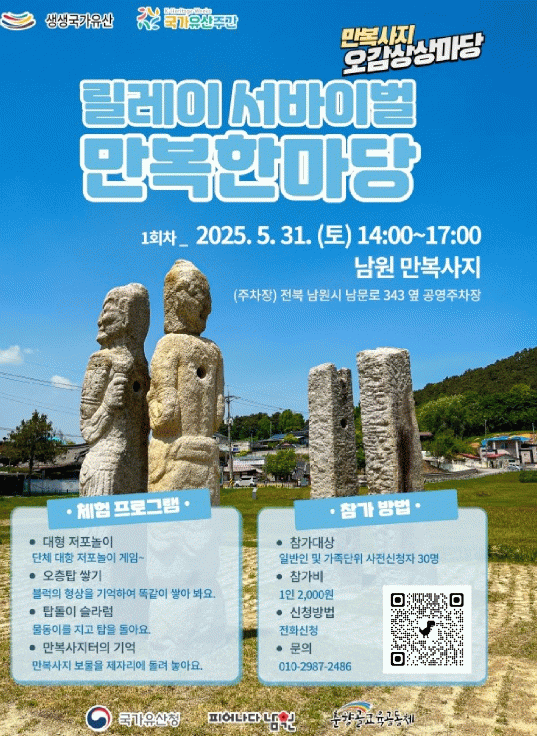 남원시 관계자는 “이번 릴레이 서바이벌 ‘만복한마당’은 국가유산을 단지 눈으로 보는 것이 아니라, 오감을 통해 직접 경험하고 표현할 수 있도록 기획한 행사”라며, “놀이와 예술, 교육이 결합된 이번 프로그램을 통해 아이들이 만복사지에 대한 흥미와 상상력을 키우고, 지역 국가유산에 대한 자긍심도 함께 느낄 수 있기를 기대한다”고 밝혔다.