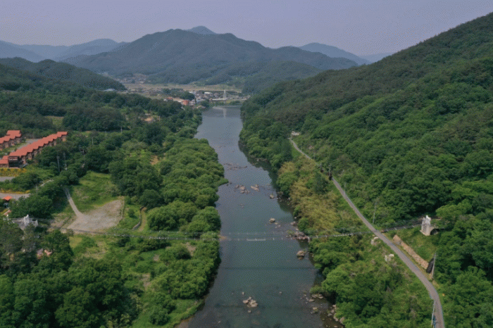 대황강을 가로질러 설치된 모험시설을 체험하다 보면 다리 아래로 눈부신 햇살을 머금고 흐르는 강물과 멀리 보이는 산속 강변의 여유가 넘치는 풍경에 잠시나마 복잡한 일상에서 벗어나는 해방감을 만끽할 수 있다.