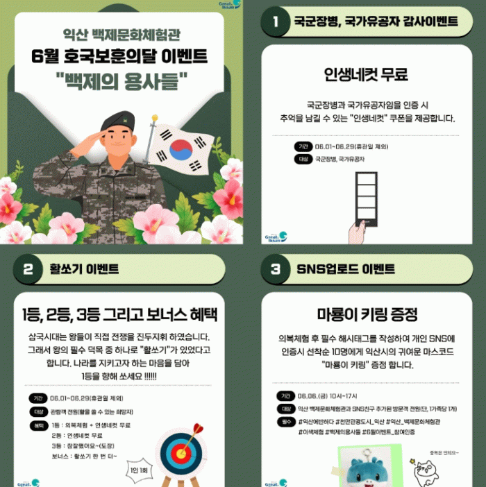 백제문화체험관 관계자는 "호국보훈의 달을 맞아 준비한 체험을 통해 시민들이 역사와 나라사랑을 자연스럽게 느낄 수 있기를 바란다"며 "국가를 위해 헌신한 분들을 잊지 않고 기억하는 시간이 되기를 바란다"고 전했다.