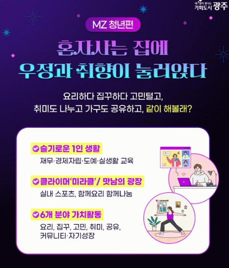 청년 1인가구는 사회관계망 형성 중심으로 한 사업을 추진하며 ▲슬기로운 1인생활(재무·경제 교육) ▲미라클(실내스포츠) ▲맛남의광장(함께요리) ▲6개분야 가치활동(요리‧집꾸미기‧고민‧취미‧공유‧자기성장) 등을 추진한다.