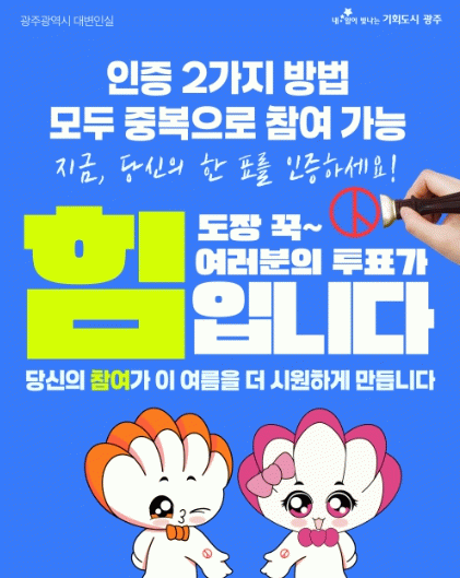 광주광역시는 사전투표 첫날인 5월 29일부터 본투표일인 6월 3일까지 6일간 전 국민을 대상으로 공식 SNS 계정을 통한 ‘투표 인증 이벤트’를 진행한다.
