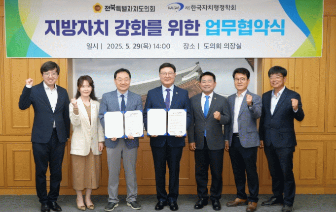 이날 협약식에는 문승우 의장, 윤수봉 의회운영위원장, 정준호 (사)한국자치행정학회 회장을 비롯한 관계자 10여명이 참석했으며, 양 기관은 전북특별자치도가 진정한 지방시대를 선도할 수 있도록 활발한 정보교류와 협력을 합의했다.