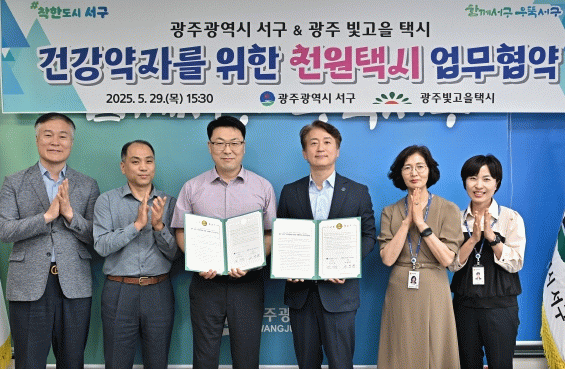 서구는 29일 오후 서구청 구청장실에서 광주빛고을콜택시와 천원택시 사업에 관한 업무협약을 체결했다. 지원 대상은 의료급여 산정특례 대상자(기초의료급여 1종) 360여 명으로 중증 암‧난치(희귀)성 질환자, 결핵 및 중증 화상환자 등이 포함된다.