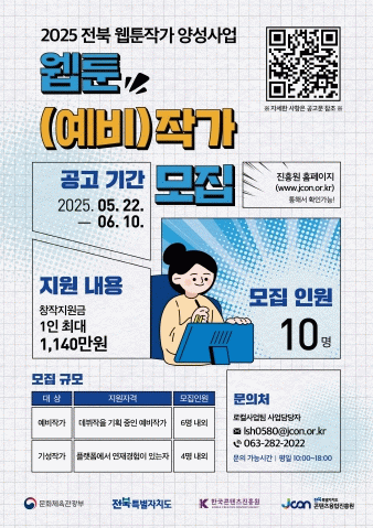 이정석 전북자치도 문화체육관광국장은 “우리 지역 웹툰 창작자들이 안정적인 환경에서 창작에 전념하고, 더 넓은 무대로 도약할 수 있는 기회가 필요하다”며, “전북콘텐츠융합진흥원과 협력해 지속가능한 지원체계를 마련하고 웹툰 산업 발전의 든든한 기반을 다지겠다”고 밝혔다.