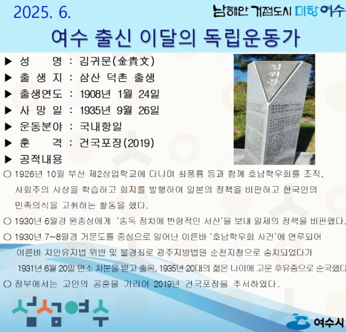 여수시 관계자는 “조국을 위해 희생하신 독립운동가들 덕분에 지금의 대한민국, 지금의 여수가 있다”며 “우리 지역 독립운동가를 잊지 않고 기억할 수 있도록 홍보에 더욱 힘쓰겠다”고 밝혔다.