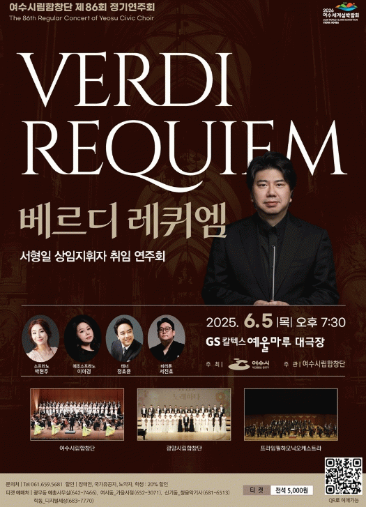 이번 연주회는 올해 새롭게 여수시립합창단의 지휘봉을 잡은 서형일 상임지휘자의 첫 공식 무대로, 이탈리아를 대표하는 작곡가이자 오페라의 거장으로 불리는 주세페 베르디(G. Verdi)의 대표작 ‘레퀴엠’을 통해 웅장하고 깊이 있는 감동을 선사할 예정이다.