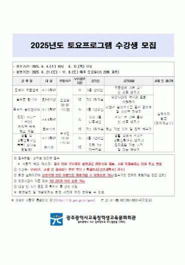신청은 학생 본인 이름으로 광주학생교육문화회관 누리집에 회원가입한 후 6월 4일 오전 10시부터 12일 오후 5시까지 할 수 있다. 강좌 시간이 겹치지 않는 경우 1인당 최대 2개 강좌까지 수강할 수 있다.