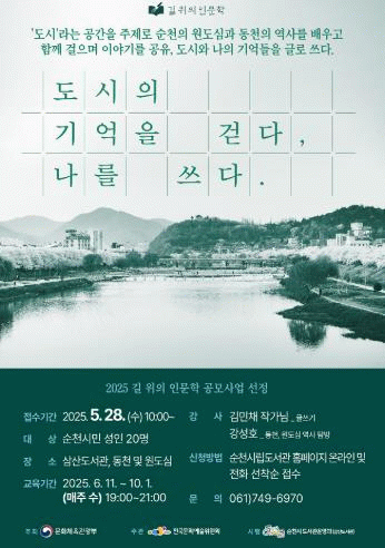 총 17회차로 구성된 이번 프로그램은 2025년 6월 11일부터 10월 1일까지 매주 수요일 저녁 7시부터 9시까지 삼산도서관에서 진행되며, 성인 순천시민 20명을 대상으로 한다.