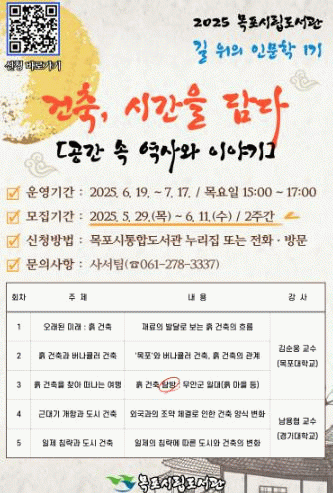도서관 관계자는 “건축은 단순한 구조물이 아니라, 그 시대를 살아낸 사람들의 기억과 흔적을 담고 있는 중요한 인문학적 자산이다”며 “길 위의 인문학 강연을 통해 지역 건축과 역사에 대한 이해를 넓히고, 도서관 또한 지역 문화의 거점으로 자리매김하길 기대한다”고 밝혔다.