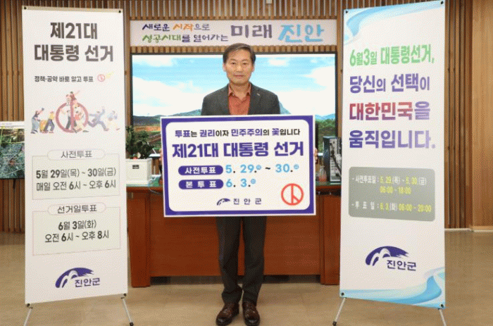 한편 진안군은 마을방송, LED 전광판, 현수막, 홈페이지, 소셜미디어, 행정전화 통화연결음, 문자메시지 등 다양한 매체를 활용해 군민들에게 제21대 대통령선거를 지속적으로 홍보하고 있다.