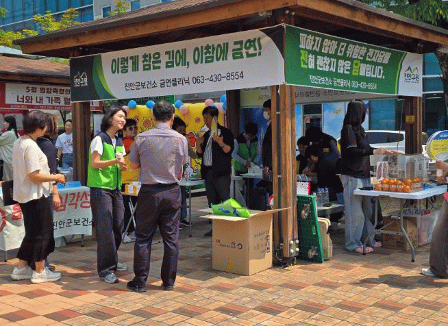 이날 행사는 진안군보건소가 전북금연지원센터, 진안군 고혈압·당뇨병 등록교육센터와 협력하여 진행했으며 금연퀴즈, 금연상담, 혈압·혈당 측정, ‘노!(NO!)담!(담배!)’ 포토존을 운영하여 참여자의 흥미를 유도하고 흡연 폐해에 대한 경각심을 고취시켰다.
