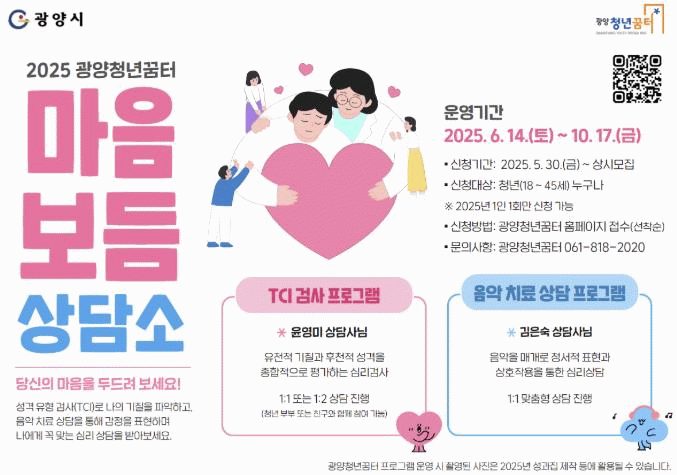 ‘마음보듬 상담소’는 오는 6월 14일부터 10월 17일까지 운영되며, TCI 심리검사 상담과 음악 치료 상담 두 가지 프로그램으로 구성됐다. 모집인원은 각각 30명과 10명이며, 광양시에 거주하거나 활동하는 청년이면 누구나 신청할 수 있다.
