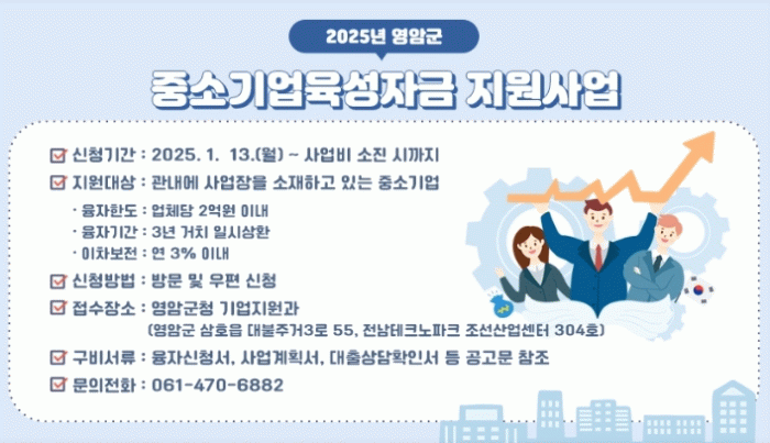 김명선 영암군 기업지원과장은 “이번 융자와 이차보전 제도를 잘 활용해 더 많은 영암군 중소기업이 혜택을 받길 바란다. 더 많은 기업하기 좋은 제도로 지역경제에 활력을 불어넣겠다”고 밝혔다.