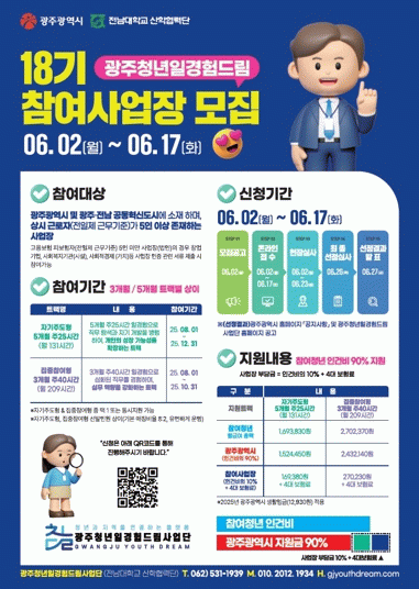 참여를 희망하는 드림터(사업장)는 17일 오후 5시까지 광주청년일경험드림 누리집에서 회원가입 후 온라인으로 신청하면 된다. 현장 실사와 심사를 거쳐 6월 말 선정 결과를 발표한다.