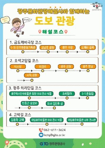 ▲금도깨비극장코스: 5‧18민주화운동기록관(전일빌딩)~금남로공원~광주극장~도깨비골목 ▲오색고담길코스: 석서정~희경루~광주공원~광주향교~사직공원 ▲광주의리단길코스: 광주역사민속박물관 야외전시 석물~조씨정려~3‧1운동탑~안중근숭모비~하서 김인후 상 ▲고박길코스: 김용학 고택~국립광주박물관 야외전시 석물~국립광주박물관 내부 전시관