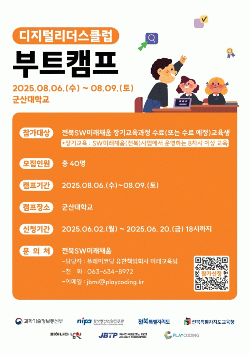 디지털리더스클럽의 부트캠프는 8월 6일부터 8월 9일까지 군산대학교에서 진행될 예정이고, SW장기교육과정(8차시)이상을 이수(또는 이수 예정인) 40명의 학생들을 대상으로 SW・AI 교육과 다양한 체험 활동을 제공해 디지털 실전 역량 강화 및 진로 설정에 실질적인 도움을 주기 위해 마련됐다.