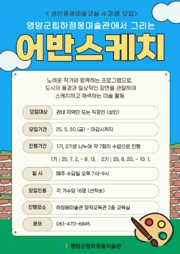 김규화 영암군립하정웅미술관 팀장은 “누구나 일상에서 예술을 즐기고 표현할 수 있도록 다채로운 교육 프로그램을 마련하고 있다. 많은 영암군민이 예술을 일상으로 들여서 여유와 창의가 있는 삶을 살길 바란다”고 전했다.