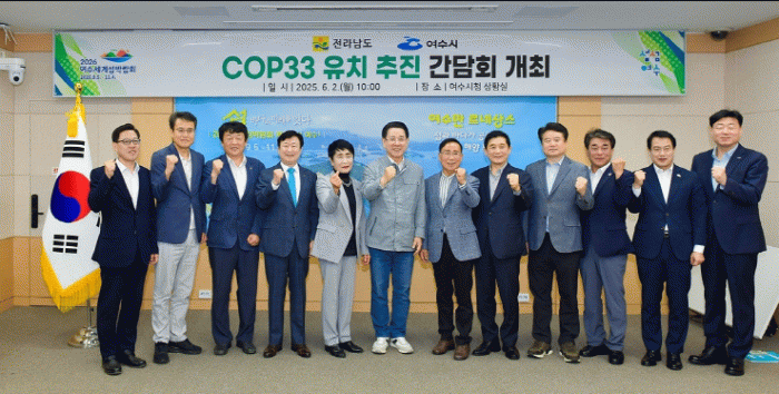여수시는 제33차 유엔기후변화협약 당사국총회(COP33) 남해안 남중권 유치를 위해 지난 17년간 중앙정부와 국회에 유치 필요성을 지속 건의해 왔으며, 2024년에는 제33차 유엔기후변화협약 당사국총회(COP33) 유치 지원 조례를 제정해 제도적 기반도 마련했다.